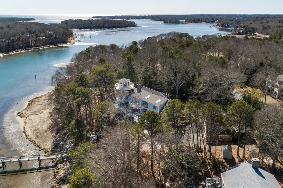 Waterfront house with a dock, three levels of living space, and expansive water views everywhere you look! The top level offers a huge Master Suite with a large bath and private sitting room with fireplace and an amazing pillow-top view straight out Popponesset Bay. The main level has a fireplaced living room, kitchen with eating area, dining room with a wonderful window seat, and a large bedroom. The surrounding decks add to the summer fun. The lower level has a walk out family room and two more bedrooms. There is even an observation room at the very top of the house! Bonus: Apartment over the garage for overflow guests. Lots of space inside and out and a fine dock for your boat (35'+/-) with easy access to Vineyard Sound. No Flood Insurance Needed!