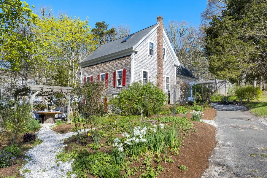 This converted antique barn has been lovingly maintained by same family for over 60 years. About a mile from Main Street, the home is like stepping into a simpler time on Cape Cod. There is rustic barnwood throughout much of the home's 3 floors. The lower level contains the kitchen/dining area and has beautiful exposed brick and hewn ceiling beams. The main level includes a spacious living area, a bedroom, a full bath and a newer family room with 3 walls of windows and brick flooring. The top floor contains 2 bedrooms and is 3 season. There are multiple outdoor seating areas including a large dining table resting on tree trunks and covered with trellised vines. There is an outdoor shower and changing area. An additional outbuilding (approx 360sqft) has electricity is currently used for storage but could be converted to a studio or workshop.