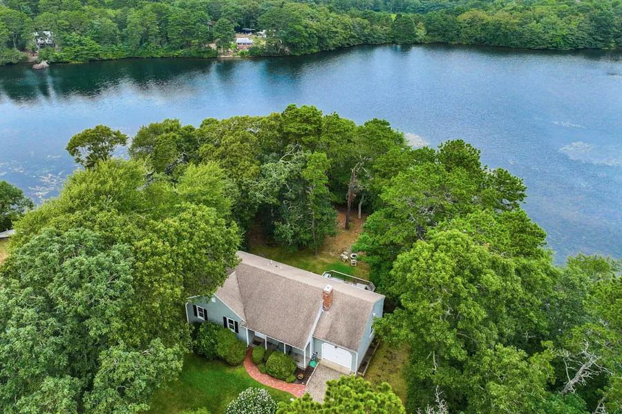 Radiant pond-front home nestled in a serene setting. This charming Ranch-style property offers single-floor living with an open-concept and breathtaking water views. The updated kitchen boasts a spacious center island, granite countertops, stainless appliances and soaring vaulted ceilings. Hardwood floors flow throughout the dining and living areas featuring a newer gas fireplace and tranquil pond vistas. This level is completed with a primary bedroom with en-suite bathroom, two guest bedrooms and a second bath. Venture down the stylish glass door to the lower level to find a vast wall of bookcases providing ample storage and display space, alongside a generous Bonus/Family Room ideal for family gatherings, a heated workshop, laundry facilities and cedar closet. The outdoor space enchants with its mature landscaping, private access to Aunt Edie's Pond for swimming & kayaking, outdoor shower and a large deck perfect for entertaining. Highlights include a new gas heating system and windows, irrigation, central vac, lovely front porch and attached garage just minutes to golf, beaches and bike path. Seller welcomes offers with requests for buyer concessions.