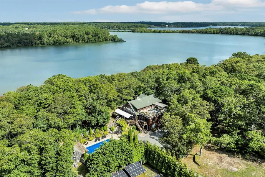 Captivating grand waterfront Country Log home is nestled in the Punkhorn Parklands on 4.8 acres! This magnificent property features a large heated pool with pool house, shed, 3 decks & a porch. The impressive home overlooks more than 400' of shoreline along Walker's Pond with a small sandy beach. A breath-taking 2 story river rock fireplace greets all entering this stunning home! Visitors will admire the log-built craftsmanship throughout the 3 spacious floors. The primary bedroom suite has a Palladian window, deck & gorgeous beamed cathedral ceiling. Included on the upper floor is a full bathroom, loft/study area & access to a 20' X 28' roof deck with pond & pool views! The inviting country kitchen has new stainless steel appliances & is open to the dining area & Great Room. The side porch & entertainment room are on the main floor as well as a bedroom & full bath. Walk out lower level includes a bedroom, full bathroom, laundry & utility/ workshop area. This fascinating property is overall self-sustaining with a field of mounted solar panels that provide year round heat, cooling & electricity. A surplus of electricity is sold back to Eversource.