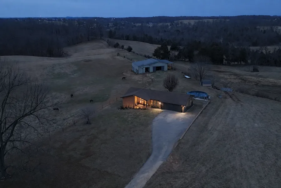 This 14.75-acre property features a newly remodeled one-level brick home and functional farm improvements suitable for livestock, equestrian use, or rural residential living. The home is set back from the road and accessed by a blacktop driveway, offering separation from traffic while maintaining convenient access to nearby town amenities.The residence includes approximately 2,200 square feet of living space and was extensively remodeled in 2024. Updates include interior finishes, fixtures, and improvements throughout the home. A new roof was installed in 2023, and new windows and gutters were added in 2025. The home offers five bedrooms and two updated bathrooms. Two of the bedrooms may be reconfigured into a larger primary suite or an office, depending on the buyer's preference.Interior features include an open living and dining area with exposed wood beams, a vaulted entryway, granite countertops in the kitchen, pantry storage, and tile showers and flooring in both bathrooms. The layout provides flexibility for a variety of household needs. A Blink camera security system is installed and will convey with the property.Outdoor improvements include landscaped yard areas and a 52-inch-by-24-foot above-ground pool located behind the home. The surrounding acreage consists of fenced pastureland with rolling terrain suitable for grazing livestock such as horses, cattle, or sheep. Fencing includes high tensile and barbed wire, along with additional sheep or cattle fencing behind the barn.A 40-foot by 60-foot barn provides four stalls, a 12-foot overhang for equipment or hay storage, and a 12-foot by 40-foot loft area with shelving. The barn was remodeled and painted in 2025, and it now includes a new roof. An additional outdoor shed offers storage for tools and equipment. Blackberry bushes are established on the property and produce seasonally.The acreage provides open pasture along with views of the surrounding countryside. Wildlife, including deer, is commonly observed in the area. The property may be suitable for small-scale farming, boarding animals, gardening, or general rural living, subject to local regulations and buyer verification.All prospective purchasers should verify acreage, utilities, zoning, boundary lines, fencing, and intended uses during their due diligence period. For more information or to schedule a private showing, contact Whitetail Properties Land Specialist Dane Driscoll.