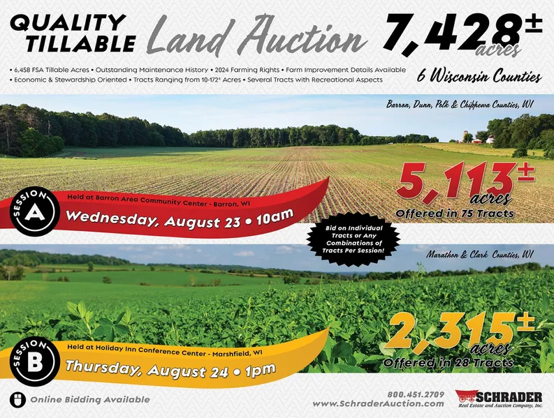 GENERAL DESCRIPTION: This Wisconsin Land portfolio is a unique & rare opportunity to acquire an expansive tillable farmland package. The portfolio, which took years to assemble, will be offered at public auction on August 23rd & August 24th via the multitract method where buyers can bid on individual tracts or any combination of tracts per session. The Barron, Dunn, Polk & Chippewa farms will be offered in Session A on August 23rd in 75 tracts, & the Marathon & Clark County farms will be offered in Session B on August 24th in 28 tracts. The farms contain an impressive maintenance history & have been well managed over the years. Do not miss this opportunity to bid your price on the farm(s) that best fit your needs in a once in a lifetime opportunity!