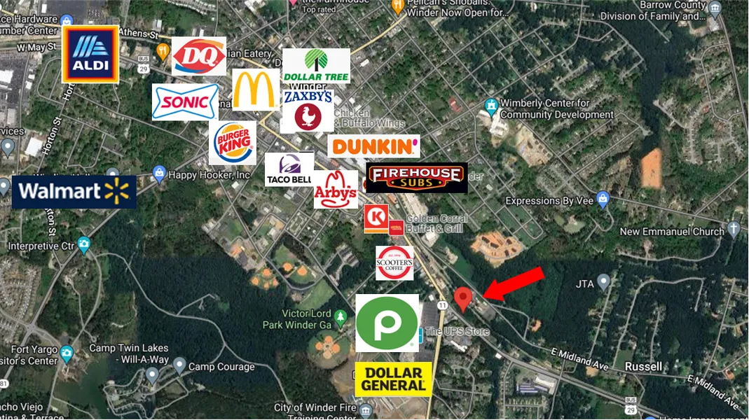 Publix Super Market, Walmart Supercenter, Bealls, Krystal, Golden Corral Buffet, Dollar General, BP, Citgo, Anytime Fitness, TireMax, Scooter’s Coffee, Firehouse Subs, Dunkin’, Verizon, Goodwill Thrift Store, Zaxby’s, Taco Bell, Walgreens, Burger King, Wendy’s, CVS, Arby’s, Captain D’s, First American Bank & Trust, Waffle House, Ruby Tuesday’s, Sonic Drive-In, McDonald’s, Cook Out, Dairy Queen, Truist, Inoko Japanese Steakhouse, Circle K, Popeyes, KFC, Aldi, and more!