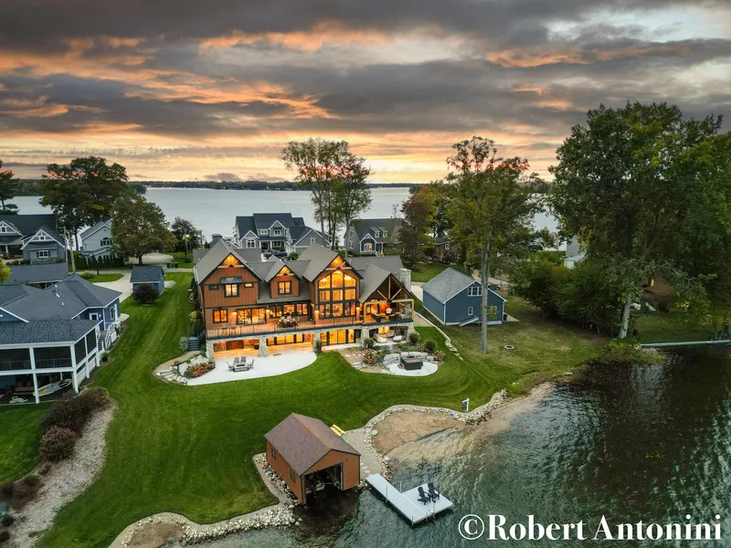Custom constructed 6 bed/5 bath home with 150' of private lake frontage on all sports Gun Lake! Bringing the natural light with an abundance of large windows overlooking the lake. The main level of the home offers a beautiful great room with fireplace, a gourmet kitchen that has an abundance of room for entertaining, primary suite with fireplace, access to the deck and views overlooking the lake, an office inside master suite, and laundry. The stunning decking spans the length of the home with two exterior fireplace seating areas, also a concrete patio with firepit, interior and exterior sound system of the home. The exterior is LP smart siding with a commercial drainage system tying in all gutters, a decorative concrete drive, 4 stall garage complete with heat, and future wiring for electric car charger. The exterior lighting with automatic dusk until dawn peak architectural backlightin...
