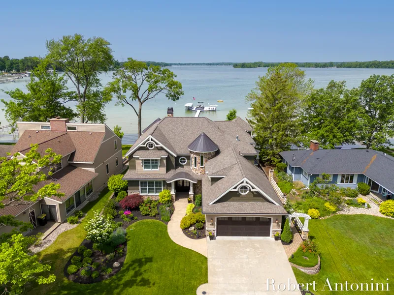 One of the truly premier properties on Gun Lake, this former Parade of Homes sensation provides all the pleasures of lakefront living; 75' lake frontage with a firm sandy beach, gorgeous sunsets, fabulous entertainment areas inside the home, outside, and on the new expansive dock complex. Unique in its magnificent design and craftsmanship, features of this home include a gourmet kitchen with 2'' quartz island and countertops, and a wood beam ceiling, a great room with fireplace, dramatic wood beam trusses, hand scraped hardwood flooring, and floor to ceiling windows to capture the beauty of the lake and abundant natural light. A must-see-to-believe lake facing office and a remarkable climate controlled wine cellar and entertainment lounge highlight the superior design and craftsmanship of the home. Up the winding grand staircase you'll encounter four additional bedrooms, two full bathroo...