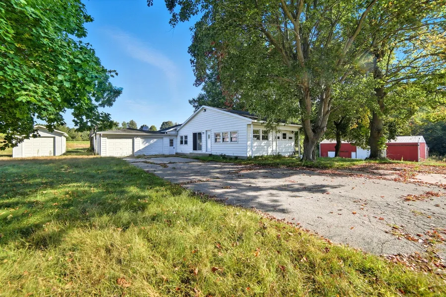 Tucked away on 4.44 beautiful acres in Carlton Township, this one-of-a-kind property offers peaceful country living with serious workspace potential. The 3-bed, 1.5-bath home includes a spacious living room addition, breezeway, and attached 2-stall garage, all on a full basement. You'll love the wide-open views and smart layout. Outbuildings include a 64x26 insulated pole barn with electric, water, and concrete floor; a 27x40 pole barn with electric and concrete floor; plus a second detached garage-perfect for a home business, hobby shop, or extra storage. Located on a paved road just minutes from Hastings and M-43, this is the rural opportunity you've been waiting for. Call for a private tour.