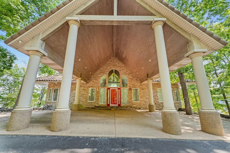 Perched on a private point along the shores of Table Rock Lake, this completely furnished 5428 sqft modern-designed home is all about sleek lines, open spaces, and jaw-dropping water views. Expansive walls of glass frame the lake from nearly every room creating a seamless blend of indoor and outdoor living. The open-concept design features soaring ceilings, clean architectural details, and a natural palette of stone and wood that mirrors the beauty of its surroundings. The kitchen flows effortlessly into spacious living and dining areas with a large capacity free standing ice maker. All baking up against the backdrop of endless lake vistas. Step outside to the deck where the horizon stretches across miles of sparkling water. A short drive down the road leads to a boat slip on a community dock with a boat lift and a hanging boat cover installed to wrap and protect your boat. Need room for guests to visit during the summertime? No worries, above the detached garage with 3 parking spaces, 1/2 bath and a shop area is a 1900sqft fully functioning fully furnished 4 bedroom and 4 bathroom guest house. This guest house is fun for the kids with a firepole extending from the loft to the main living area. This is more than a home--it's a statement of modern lakeside living, designed for those who value luxury, privacy, and panoramic beauty.