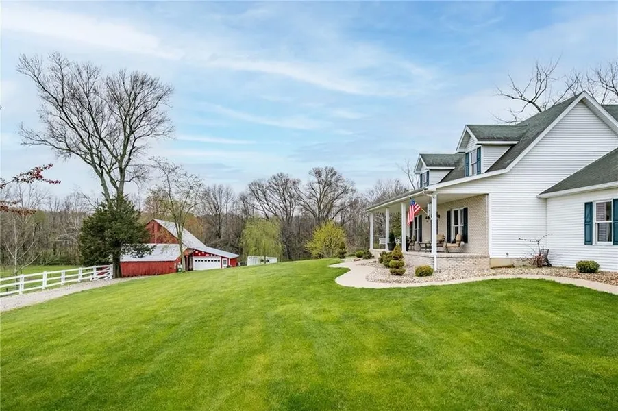 Lovely secluded horse farm located on 11.34 rolling acres, partly wooded located at the end of 50W. Home features covered front porch overlooking pastures, open floor plan with large kitchen island & all stainless kitchen appliances to remain, finished basement, attached 3 car garage (one side 2 deep).Horse barn with water & large workshop with concrete floor & electric; hog barn; pole barn with concrete floors, electric, water & 6 horse stalls; pastures fenced with electric fences; smoke house with fantastic character & storage area for pool; 28x15 pool. Recent updates: new HVAC, interior paint, floor coverings, interior doors, cabinets w/Quartz counter tops, updated baths & new FP. Well maintained, ready to move in and enjoy!!