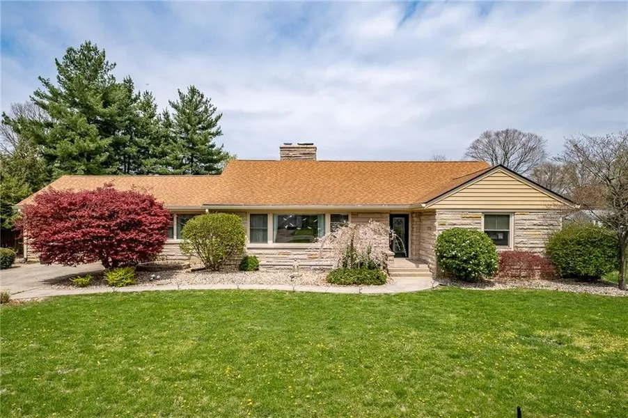 Bedford stone ranch with hardwood floors throughout. Updated kitchen. Large formal living room with a gas fireplace and built-in bookcases. The partial basement is finished with a wood burning fireplace. Sunroom overlooking the huge totally fenced backyard with a patio, many raised flower beds & a storage barn. New Pella windows except the sunroom. This home has all new gutters, soffits, gables and chimney cap. Excluded in the sale: arbor in backyard, yard decor, quilt square on shed, barn door in hallway (will put original door back on), stained glass window in living room, wall light in basement and master bedroom headboard. This home has so many cool things, its a must see!!