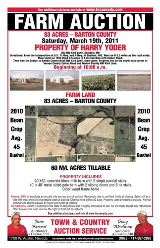 This farm land consists of 83 acres of farm land in Barton County, with 60 acres m/l tillable. The property also includes a 20'x50' concrete block milk barn with nine single parallel stalls, a 40'x48' metal sided pole barn with two sliding doors and eight tie stalls, and also an older wood frame home.