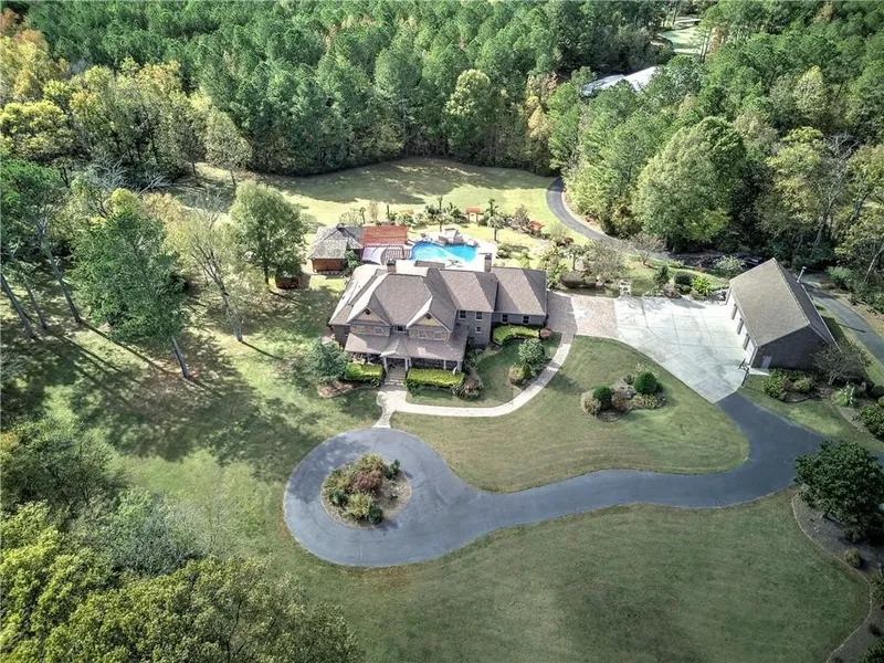 Experience luxury living at its finest in this stunning 5-bedroom, 4 full bath, and a half bath estate with beautifully designed space. Tucked behind a private gated entrance and surrounded by lush, manicured landscaping, this property delivers an unmatched sense of privacy and resort-style living complete with an in-ground pool, covered pavilion, expansive deck, and multiple garages perfect for work, hobbies, or storage. Step inside the grand two-story foyer, where gleaming hardwood floors lead you to the elegant dining room with a coffered ceiling, private office, and an impressive two-story family room showcasing a stone wood-burning fireplace. The open layout continues into the breakfast area and gourmet kitchen, featuring a massive granite island, tile backsplash, stainless steel appliances, and a seamless view into the inviting living room with exposed wooden beams for added warmth and character. The main-level primary suite serves as a true retreat, offering tray ceilings, an electric fireplace with a cozy sitting area, direct access to the back deck, and a spa-inspired bathroom. Enjoy a tiled shower, separate grand soaking tub, dual vanities, and an oversized custom closets complete with built-ins and an island for exceptional organization. A half bath and mud/laundry room complete the main floor. Upstairs, you'll find four additional bedrooms-each with unique charm-along with two full bathrooms. The terrace level offers even more room to live, work, and entertain with a second kitchen, media room, exercise room, abundant storage, and walk-out access to the backyard oasis. Outdoors, the covered back deck overlooks your private paradise: a sparkling pool, hot tub, covered poolside pavilion, and stunning landscaping ideal for hosting family and friends. Car enthusiasts, hobbyists, or business owners will love the attached 3-car garage a detached 4-car garage, plus a massive ~7,500 sq ft heated/cooled garage/workshop with room for multiple vehicles, equipment, or specialized use. This extraordinary property offers luxury, privacy, and versatility at every turn-truly a rare opportunity to own a one-of-a-kind estate.