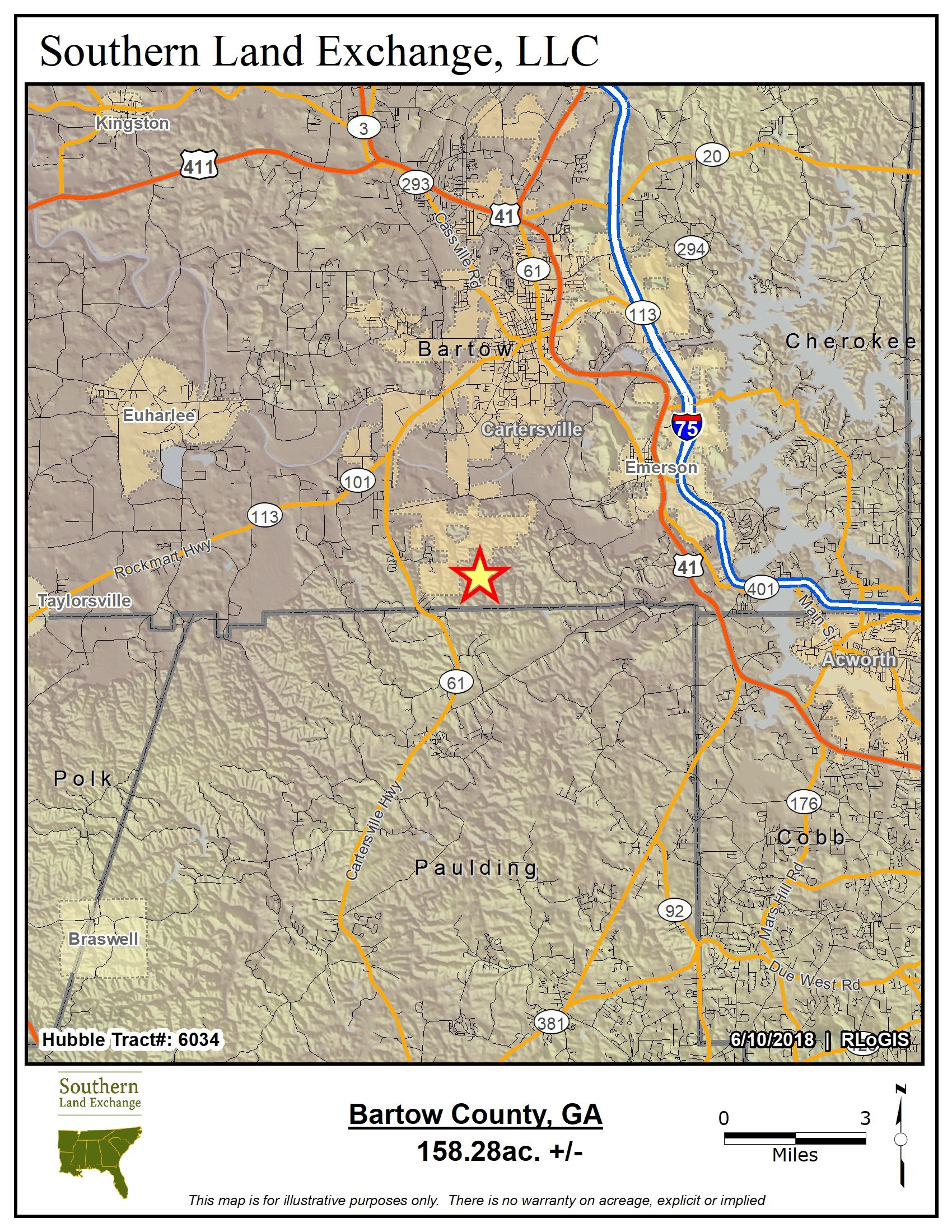 Research Parcel InformationI-75 North to Red Top Mountain Exit. Exit west on Red Top Mountain Road. Proceed west for 2.5 miles. Road will transition to Old Alabama HWY. Continue west on Old Alabama Road for 5 miles until Old Alabama dead ends into GA HWY 61 (On the south end of the Cartersville Airport) Turn south (left) onto HWY 61. Proceed approximately 3 miles and turn left on Douthit Bridge Road. Follow Douthit Bridge Road (Road turns into a single lane gravel road) for 1.6 miles. Road dead ends into the property.