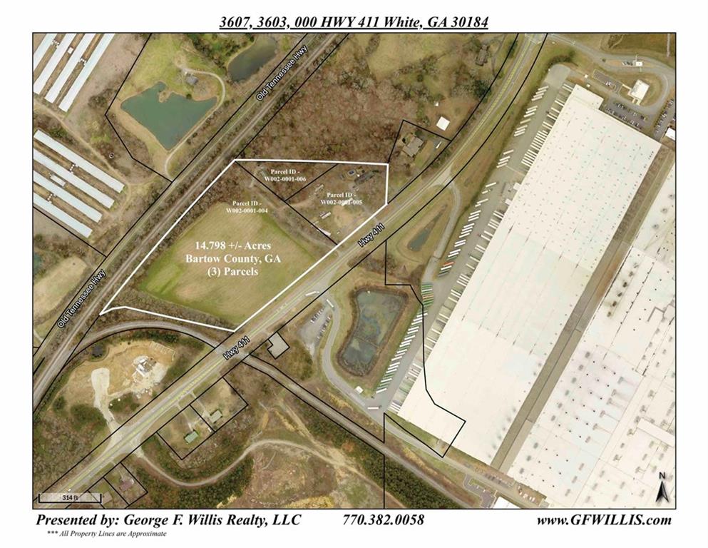 DO NOT DISTURB TENANTS - Three parcels in the City of White, GA (Parcels W002-0001-006, W002-0001-005, W002-0001-004). These properties will need to be rezoned to be used in a commercial capacity. Current use is as a Hay field and as rental income producing property. This site is approximately 4 miles off Exit 293 on I-75. This site is mostly level with a slight ridge on the northern end of the property. This property fronts US HWY 411 with rail on the rear. Owner reserves the right to move the barn and the white trailer off of the property, these two structures are not included in the sale.