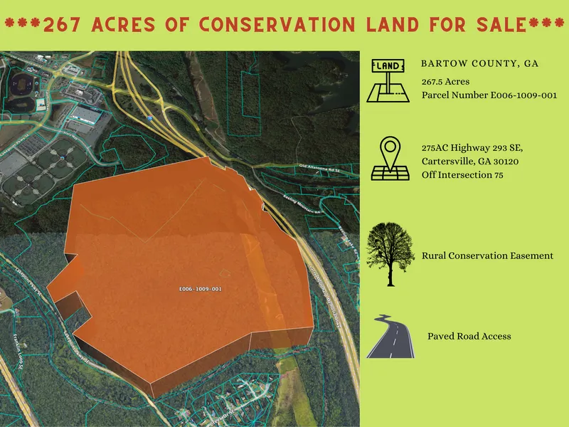 Have you been in search of a larger track of land in the North Georgia area? Check out this property just listed in Bartow County. It consists of 267 ACRES. It is conveniently located just minutes from Interstate 75 and a very quick ride to LAKE ALLATOONA. Close to Shopping and restaurants. Also, just down from the all popular LakePoint Station, LakePoint Sports and other great outdoor activities. There is also Pumpkinvine Creek that runs along the property. The PROPERTY IS IN A CONSERVATION EASEMENT AND CANNOT BE DEVELOPED.