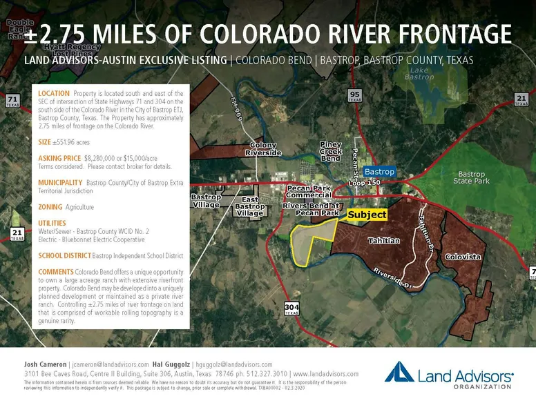 Colorado Bend offers a unique opportunity to own a large acreage ranch with extensive riverfront property. Colorado Bend may be developed into a uniquely planned development or maintained as a private river ranch. Controlling 2.75 miles of river frontage on land that is comprised of workable rolling topography is a genuine rarity.
