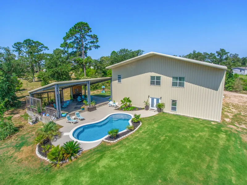 This 60' x 70' Barndominium features 10' ceilings and stained concrete flooring. Large entertainer's kitchen with Butler's pantry, marble tile counters, 2 pantry's, solid wood cabinets and breakfast bar. The office is equipped with a built-in queen Murphy bed. Huge master oasis with 3 head shower and slate walls and floor, jetted luxury tub and extravagant master closet. Upstairs bonus is perfect for sitting room or play. Four acres, RV pad, covered patio with fireplace and custom pool!