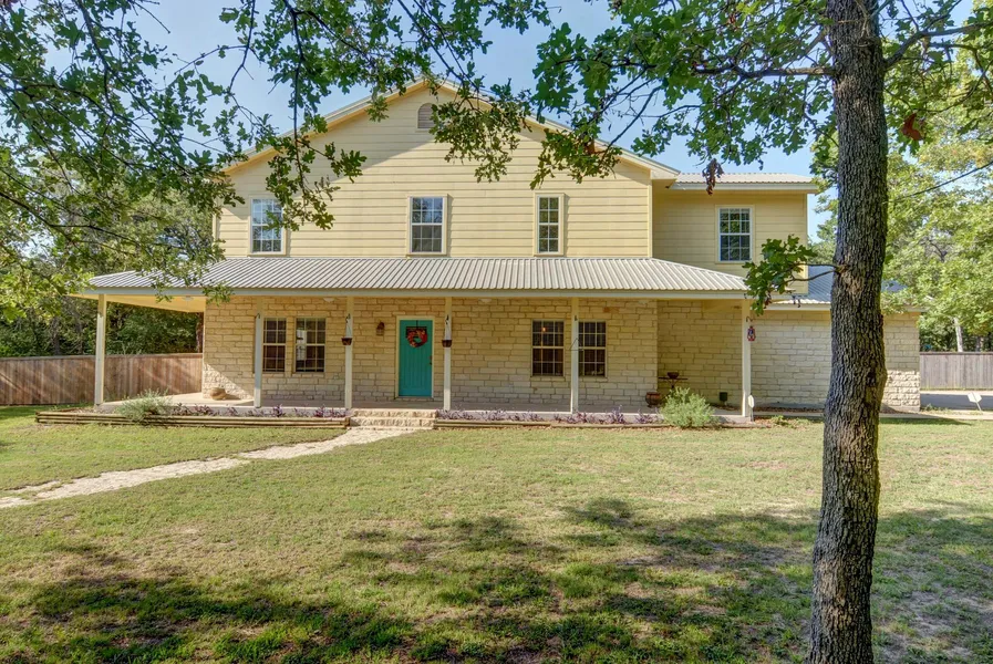 Wonderful Family Home at The Arbors at Dogwood Creek! ~ Wooded, corner lot on 1 acre with privacy fence & spacious yards. White limestone, Texas farm-style home with front & back covered porches & metal roof. Open kitchen & dining area w/ French doors to porch. Office/study or bonus room off kitchen area. Downstairs has stained, scored concrete flooring. All bedrooms are upstairs & carpeted. Interior has been recently painted. Peaceful, gated community between Elgin & Bastrop with convenient commute to Austin.