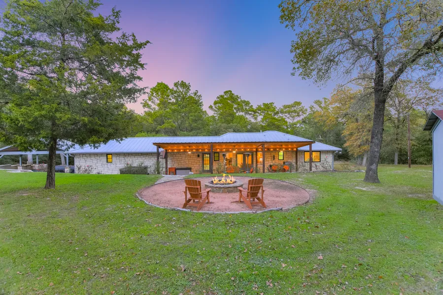 Private Retreat in the Pines! ~ As you drive down the winding, asphalt road and cross the intermittent creek, youll know in a heartbeat this place is special. Five beautiful acres in La Reata Ranch with towering Loblolly pines, oaks, and cedars greet you. The limestone ranch-style home (2373sf) is tucked back and secluded. Two primary suites plus two secondary bedrooms provide wonderful options. One of the primary suites has wider doors, a separate entrance with French doors, and handrails in the spacious shower. It also has a separate living area. The country kitchen has oak cabinets, stainless appliances and is open to the family room and is separated by a large granite island and breakfast bar. The refrigerator and dishwasher have been recently replaced as well as fixtures and lighting. Other improvements and updates include the installation of engineered hardwood plank flooring, replacement with black dual pane windows throughout, interior and exterior have been painted and a tongue-and-groove cover with industrial fans over the patio has been added. A complete list of improvements is available upon request. The current owners have used this as a second home retreat and love entertaining their friends on the covered back patio and lawn that is complete with twinkling lights, a hot tub, a lighted bocce ball court, and a zip line! The backyard has been cleared to provide open space for enjoyment and to enjoy the wildlife and the bright stars at night. Invisible fencing exists in the front and back for Fido! A two-car detached garage with a window unit was once used as a music studio and would be ideal for a workshop. There is also an attached two-car carport and an eclectic storage building on the property. Dont miss the treehouse on the left as you drive in. It sleeps three with an added cost and has to air-condition and would also make a great hideaway or reading room!