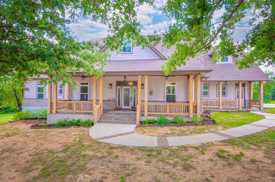 Enjoy the beautiful Texas sunrises and fascinating wildlife from your large back porch! This country living at its finest. Custom built, farm house design interior with so many elegant touches. Porcelain tile throughout, two fireplaces, one in the gorgeous formal dining, the other in the cozy family room. Open and spacious floor plan, spectacular entry way with shiplap wall, wood look ceramic tile and inviting archways. Gourmet kitchen offers a farm style sink, stainless appliances, built-in ovens and smooth cooktop. Guest suite offers a separate entrance and its own bath just off the mudroom. Main level owner's retreat has a private entrance, large walk-in closet, an abundance of storage, jetted tub and seamless door shower. Secondary bedrooms share a Jack-n-Jill bath. Stairs lead from the mudroom upstairs to a large loft with half bath and cat walk overlooking living area. The details in the home are a must see! Large detached garage with attached carport wired for an EV outlet. Two Rinnai propane waterless heaters.
