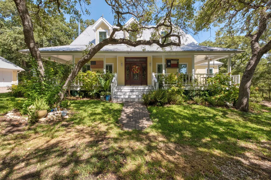 Nestled at the secluded end of a winding driveway enveloped by a canopy of mature trees, this exquisite 5.13 acre property presents a captivating retreat. A symphony of elegance and functionality, the beautiful home boasts a wealth of storage options both indoors and outdoors, catering to all your organizational needs. The allure of plantation shutters gracing the windows beckons you inside, where stunning wood flooring seamlessly unites the spaces. A luminous family room, adorned with a ceiling fan, welcomes gatherings and relaxation. The expansive kitchen stands as the heart of the home, featuring a central island and breakfast nook, stainless steel appliances, and culinary delights await with a Castle 6-burner gas grill and flat griddle grill. The primary suite indulges with its generous proportions, including a luxurious bathroom boasting a double vanity, a separate office/sitting area, dual walk-in closets, and a soothing jetted tub. Ascend to the upper level to discover a media/home theater, perfect for entertainment enthusiasts. Grand windows bathe the interiors in natural light while offering tranquil views, and a wrap-around porch invites you to immerse in the serenity of the surroundings, with a serene creek meandering through the property. The historical charm of a front door sourced from a Pennsylvania farmhouse over a century old, along with exquisite antique lights and fixtures, adds a touch of timeless elegance. The fireplace is a Lopi Leyden wood burning stove. Solar panels embrace sustainability, while the meticulously landscaped backyard, complete with a sprawling greenhouse, caters to the aspirations of any gardener. A detached two-car oversized garage provides ample space and additional storage. A well or Aqua water can supply this home. Two, 1,000 gal propane tanks. This property encapsulates the harmony of luxurious living, historical allure, and modern convenience. The Telsa GigaFactory is 24 miles, Austin is 34 miles, the airport is 21 miles.