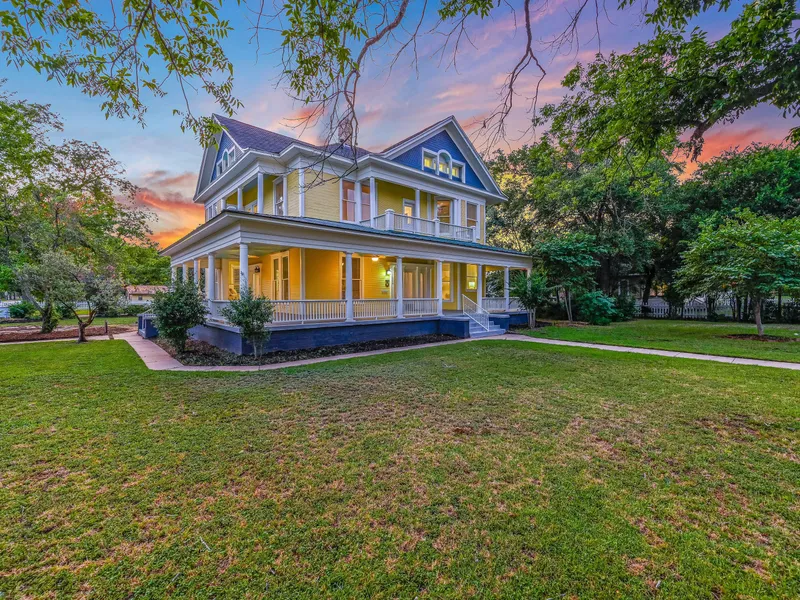 Neo Classical Revival Beauty! ~ Built in 1910, this historic gem has been the home to only 4 families throughout the years. It has been lovingly restored by the current owner. Their goal was to keep its historic charm, but also to add modern conveniences. A complete remodel of the kitchen features a Viking range, leathered granite counters, Carrera marble topped central island and an abundance of cabinets for storage. All the bathrooms have been updated to include marble counters, glass showers and two of the baths have delightful soaking tubs. Gleaming longleaf pine and oak floors throughout the home have withstood the test of time. The floor plan flows beautifully and the main level also has a spacious living room, a parlor with an original coal fireplace, a large formal dining room for entertaining family and friends, a primary bedroom with full bath, a half bath and a utility room which has bench seating for a cozy breakfast area. The second level has 4 huge bedrooms, a sunroom, 2 full baths and double balconies. The attic has been finished out and offers flexible space as bonus room or conditioned storage. Enjoy sitting on the wide wraparound porch, and waving to neighbors. The home is located on a .80 acre corner lot complete with towering pecans and live oak trees, a white picket fence, a detached 3 car garage and a greenhouse. Recognized in the National Register of Historic Places and a Bastrop Historic Landmark. Own a piece of Bastrops history and become the next steward of this fine home.