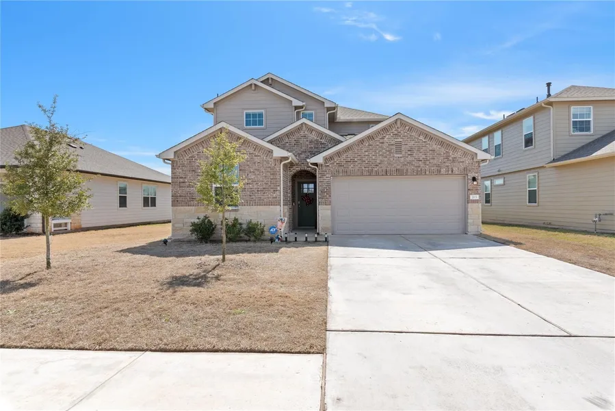 Welcome to 203 Rainmaker, a stunning 4-bedroom, 3 Full-bathroom home built in 2021, offering modern comfort and style. Nestled against a serene greenbelt, this home provides a peaceful retreat with no back neighbors. The inviting floor plan features an open kitchen that seamlessly flows into the family and dining areas, perfect for entertaining. Enjoy the elegance of granite countertops, gas cooking, and a mix of laminate flooring and plush carpet throughout. The spacious secondary bedroom and full bath downstairs add convenience, while the large game room upstairs offers endless possibilities. The Wilson floor plan includes a professionally landscaped and irrigated yard, complete with a generous covered patio for outdoor relaxation. This pet-free home comes equipped with a washer, dryer, and refrigerator, making move-in a breeze. Plus, enjoy smart living with the Home Connected base package, featuring Alexa Voice Control, a smart front doorbell and deadbolt, a home hub, light switch, and thermostat. Residents will also love the beautiful community pool, perfect for warm Texas days. Don’t miss this exceptional home! Information provided is deemed reliable but is not guaranteed and should be independently verified.