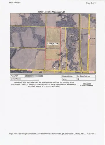 42ac of pasture/hay ground w/pond,timbered perimeter and secluded for hunters located just N of Hume, MO. survey tape on property corners