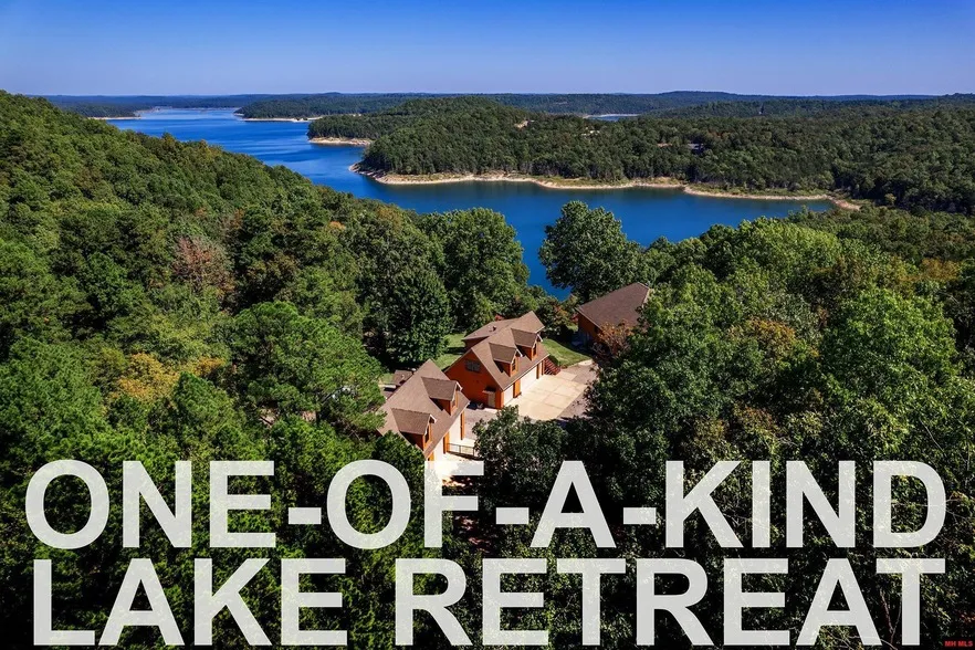 This custom lakefront property offers many wonderful amenities and tons of living space, approx 3757 finished sq ft, for family, friends, or guests. The 2463 sq ft main house features 3 bedrooms and 2 bathrooms. The guest house offers a large garage with upstairs 1 bed/1 bath apartment w/full kitchen, another 3 car garage w/upstairs game room w/pool table, lounge with 1/2 bath. Sprinkler system throughout yard to keep the beautiful landscaping and zoysia yard looking great all summer. Gourmet kitchen with all high-end appliances. Among its standout features is a room designed for the stargazer, complete with a manually retractable roof, allowing you to bring your telescope and enjoy unparalleled views of the night sky. This unique addition complements the other exceptional amenities, including: a hot tub perfectly positioned to take in stunning views of Norfork Lake, a whole house generator for backup comfort. All this and more nestled on 3.3 ac m/l, minutes away from Jordan Marina.
