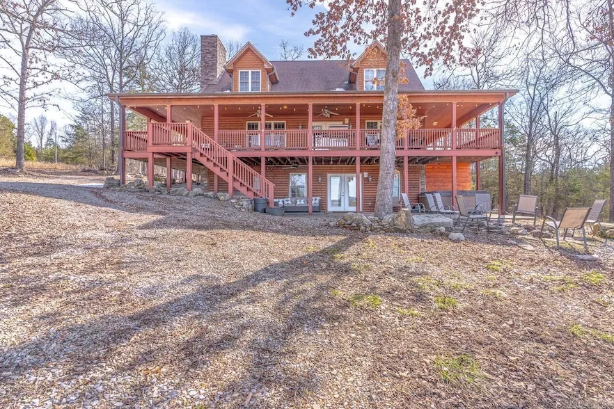 Welcome to Market 205 Cooper Kate Trl of Norfork, AR. Nestled on 20 +/- wooded acres off of Hwy 63 is a log cabin wrapped in stone & cedar, topped w/ architectural shingles and accented by a wrap-around deck, and covered patio. The interior features 2800 +/- sf of well laid out living space that contains an open concept living/kitchen/dining area. The living room holds a soaring wood ceiling, wood burning fireplace with stone surround and access to the deck. The eat-in kitchen contains granite countertops, bar seating, stainless steel appliances and pantry. The Master is on the main and has deck access, a walk-in closet, jet tub, and custom walk-in shower. Upstairs you'll find a spacious landing, guest bedroom, guest bathroom w/ shower/tub combo, and an office. The finished walk-out basement features a full eat-in kitchen, living room, guest bathroom w/ shower/tub combo and access to the patio. You'll love the panoramic mountain views from almost every room, that the property sleeps 12 comfortably, the bonfire pit, and the 40 x 40 floored & wired shop. Conveniently located 5 minutes from the White River and 10 minutes to Norfork Lake. Furnishings are negotiable. Call today to tour.