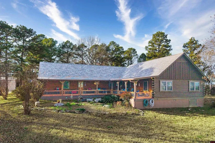 Charming log home tucked away in a peaceful, wooded setting teeming w/ wildlife. Enjoy quiet mornings on the wrap-around front porch w/ 3 ceiling fans & porch swing. Conveniently located just 15 min. from Mountain Home & 10 min. from Norfork, home offers 2 BRMS, 2.5 baths & extensive remodeling in 2023. The stunning main bath features a jetted walk-in tub, curbless tiled shower w/ dual controls, copper sinks, granite counters, hickory cabinetry, tile floors & tin ceiling. Primary suite inc. walk-in closet, dedicated shoe closet & office behind French doors. Kitchen boasts granite countertops, farmhouse fireclay sink, Fisher & Paykel 5-burner cooktop, GE Caf double ovens, 2 refrigerators & walk-in pantry. Vaulted wood ceilings & wood-burning fireplace insert create a cozy lodge feel. Multiple outbuildings inc. a garage, enc. barn, workshop, pole barn & a climate-controlled she-shed w/ high-speed internet. Automatic dusk lighting & driveway alarms complete this exceptional property.