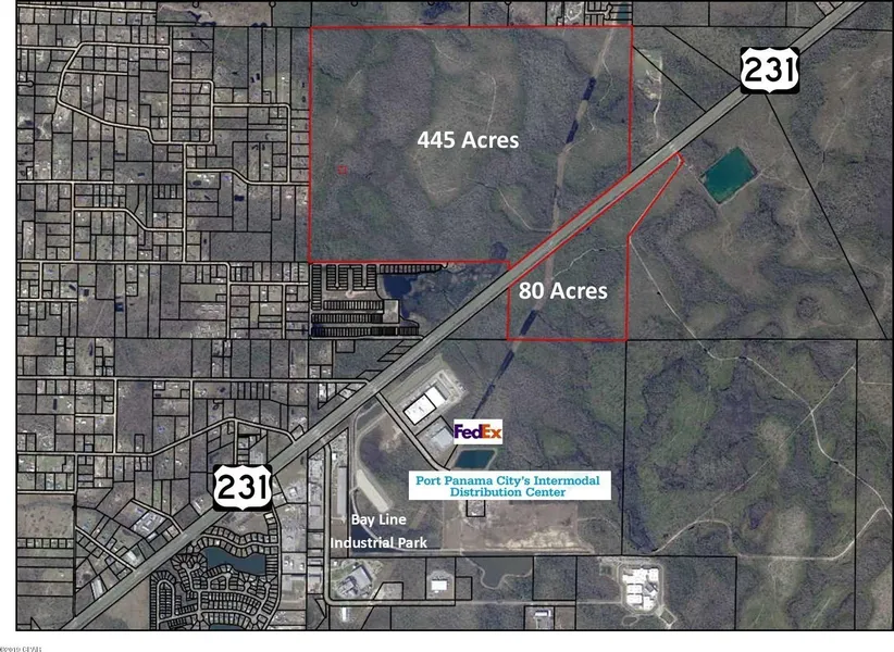Approximately 80 acres with +/- 3,700 feet fronting U. S. Highway 231 with a median-cut on the north end. This property is currently zoned AG-1. Located in Bay County and just 1/2 mile north of the main entrance to Port Panama City's Intermodal Distribution Center. (Commerce Boulevard. With land use change to industrial and incorporation into Panama City limits, the property would make ideal commercial or industrial site and is located adjacent to the Intermodal Distribution Center. The new 250,000 sq. ft. FedEx distribution center is now under construction. Rail Service available. Measurements are estimates only.