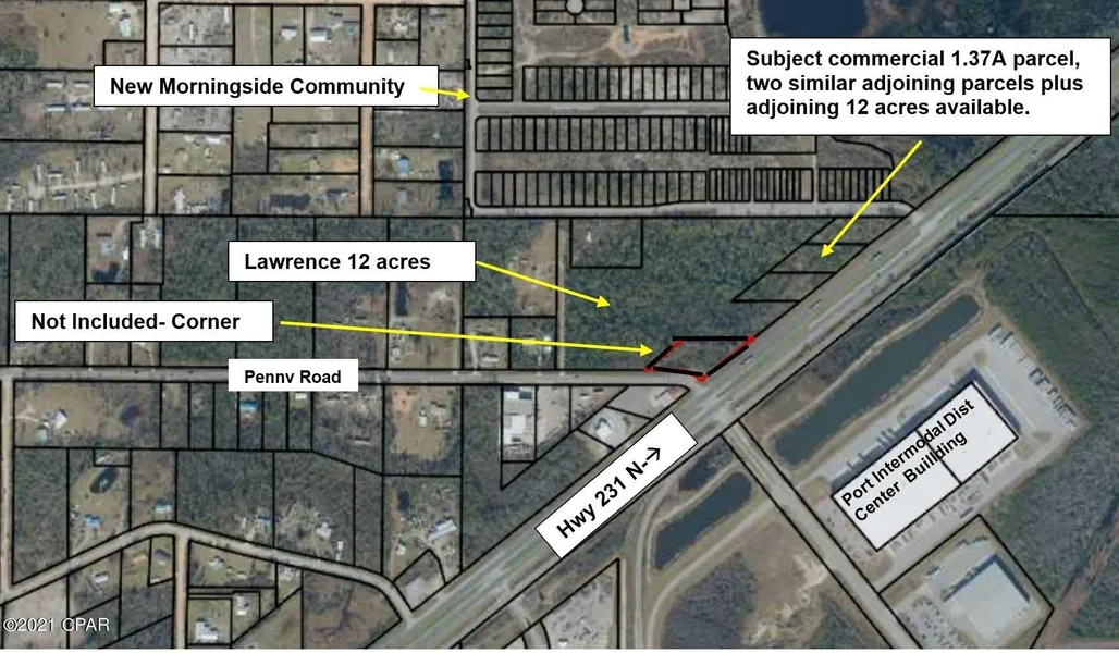 Remarks: Outstanding corner across from the intermodal distribution center on Hwy 231 at the corner of Morningside Drive, residential subdivision. Traffic County 27,500 AADT January 2020 and growing! This is one of three parcels of equal size adjoining, totaling 600 feet and 4.1 acres available until one of these parcels is sold. Owner has cleared, added fill to make the property shovel ready. County GIS shows elevation 55-60 feet above sea level. These parcels are not shown as a flood hazard area on FEMA maps. Exactly 10 miles from intersection of Hwy 231 and Hwy 77 in a rapidly growing area just north of Hwy 231 planned enhancement project.