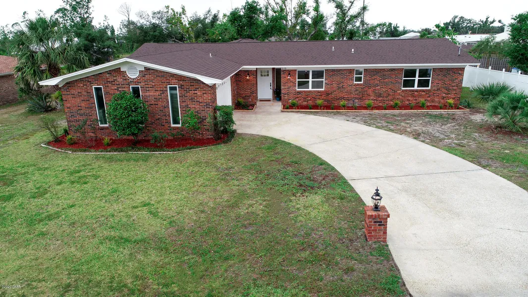 Stunning remodel on this 2832 Sq. Ft. 4-bedroom, 2 baths all brick home situated on an X-large .8-acre lot close to Tyndall AFB. All-new: roof, double pane vinyl windows, doors, tile and LVP flooring, 50+ LED can lights and fans throughout, Kitchen with custom cabinets, large island, quartz countertops, and Samsung Black Stainless appliances. All bedrooms are oversized, Master Suite boasts double closets, double vanities, and ceramic tiled shower. Home features a breathtaking open concept Great Room leading to a huge Florida room. Finishes include a shiplap feature wall and barn door to Bonus/Flex room off kitchen. Oversized 2 car garage with additional laundry, sink, and storage closets. Home is like new. All of this for under 115. per sq. foot