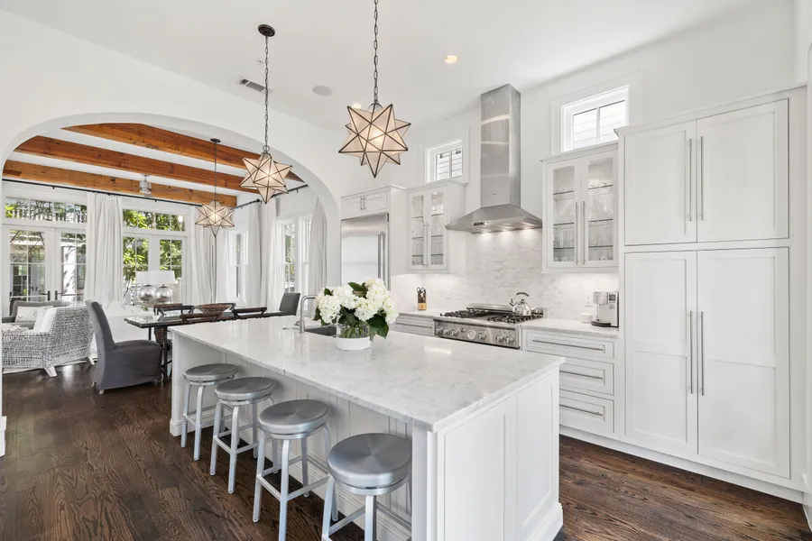 It creates an alluring ambiance, which continues through an open arch, connecting the dining room with the gourmet kitchen. Stainless steel appliances, a central island and marble countertops provide the necessary inspiration for creating humble snacks or elaborate dinner parties. Dark flooring continues upstairs where three ensuite bedrooms including a spacious bunk room provide guests with home comforts while enjoying the ultimate privacy and convenience. The well-lit master suite is a sanctuary of zen-like calm with its own soaking tub in the well-appointed bathroom. Front and rear porches on both levels provide quiet areas for relaxing in the breeze or socializing with friends and neighbors. There's a paved terrace and parking for two cars in dappled shade to the rear of the property. Those looking for an active lifestyle close to the beach will not be disappointed. Rosemary Beach Fitness Center is fully equipped for a workout while bike and walking trails encourage you to explore the surrounding area. Boutique shopping, high-end dining and live entertainment will all find their way onto your social calendar when you live in this exclusive master-planned community.