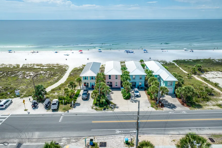 Nestled in the enchanting Laguna Beach area on the west end of Panama City Beach, this gulf-front home is a coastal retreat that epitomizes shabby chic elegance. The property has undergone a meticulous transformation, making it a tranquil haven with a slice of pristine white sand beach just steps away from a spacious back patio offering unparalleled vistas. Every detail has been considered in the renovation. The home is fortified with impact-rated storm doors and windows and state-of-the-art hurricane shutters installed in January 2021 — controllable via smartphone. The outdoor space features durable Trex composite decking, and the underbelly of the home is sealed with spray foam insulation. The HVAC system, Rinnai tankless water heater, and metal roof have all been recently updated, ensuring the home's longevity. Step inside to a well-appointed kitchen, complete with top-of-the-line appliances and a gas range. The interior exudes the freshness of new construction, complemented by designer lighting and all-new furnishings as of 2021. The main floor houses a cozy bedroom, a completely refurbished bathroom, and the heart of the home: the kitchen, living and dining areas. A washer and dryer are discreetly tucked away off the kitchen, along with ample under-stair storage. The second level is equally inviting, featuring two guest bedrooms and a remodeled bath. The crown jewel is the expansive master suite, offering panoramic gulf views. The master bathroom is a sanctuary in itself, boasting a separate shower, garden tub, double vanity, and a spacious closet. Never offered as a rental and impeccably maintained by its current owners, this home stands as a hidden gem amidst the rising tide of towering rental properties in the area. Whether as a second home, a rental, or a primary residence, this property offers exceptional value. Embrace its shabby chic allure and make this coastal sanctuary uniquely yours.