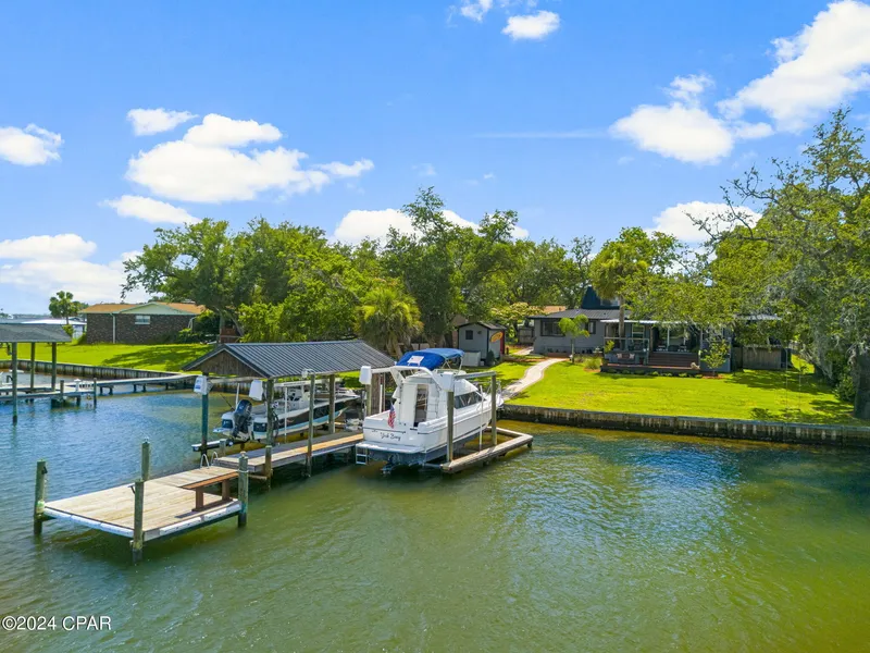Welcome to your waterfront paradise directly on the water! Perfect for nature enthusiasts, this beautiful east-facing home offers a serene escape where you can fish, boat, or simply unwind on the shaded covered deck overlooking the bayou. Sit on the dock and watch dolphins, manatees, pelicans, osprey, or the mullet jumping. Enjoy stunning moon rises and avoid the hot west sun, making your evenings cool and comfortable.For avid anglers, the dock provides prime fishing opportunities for redfish, trout, blues, mullet, and a variety of bait fish. With direct access to St. Andrews Bay, East Bay, and the Gulf of Mexico, your boating adventures are just moments away.Updates to this gorgeous home are not limited to, but include New roof in 2022! New HVAC in 2021, inside and outside unit, installed by Peaden with a 10 year transferrable warranty! Enhance your waterfront lifestyle with a 2002 Bayliner 2858, boasting only 520 hours. This pristine 30-foot boat features a command bridge, spacious cabin, and bow thruster, with one of the widest beams available for a single-engine boat. Stored on one of the two boat lifts at the dock, it can be negotiated with an acceptable offer. Additionally, the second lift under a boat house is available for your fishing or sport boat. The expansive dock, lifts, and boat house create the perfect backdrop to your private backyard, which includes 100 feet of waterfront and a seawall on this deep-water bayou.Embrace the tranquil water front lifestyle with a majestic oak tree, multiple mature palms, and fruit trees adorning the property. Conveniently located just minutes from Tyndall AFB (only a 6-minute drive), Mexico Beach, and Panama City Beaches, you'll have easy access to all the local attractions. A nearby marina, just a two-minute boat ride up the bayou, provides all your bait, food, drink, and fuel needs.Inside, three of the four bedrooms offer direct views of the bayou. The den boasts an impressive water view through 18 feet of glass, 12 feet of which are sliding doors that fully open, showcasing the stunning backyard and unobstructed views of Pitts Bayou. The living room windows also overlook the bayou, and the shades are remote-controlled for your convenience. Additionally, the garage door operates via Bluetooth for easy access.Experience the best of bayou -living in your dream home!