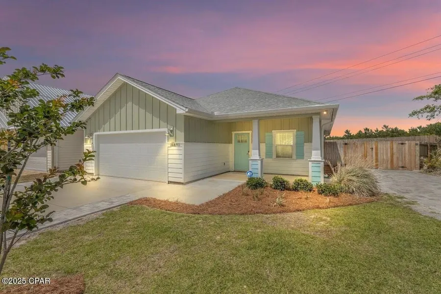 Paradise found at 21400 Marlin Avenue, a perfect beachhouse with a POOL in Panama City Beach, FL! Escape to your dream vacation home located in the heart of Panama City Beach, 1/2 MILE from sugar white sand beaches and pristine waters of the GULF OF MEXICO. NO HOA, Short Term Rentals ALLOWED and just minutes from local restaurants & all the adorable neighboring beach towns of iconic Scenic Route 30a. This turn-key pool home built in 2021, is like-new, offers easy access to the nearest gorgeous beaches located at the desirable West End of Panama City Beach. Welcome to 21400 Marlin Avenue, complete with coastal inspired furnishings, kitchen essentials, decor, and a 4 seater electric ICON golf cart to convey; It is the perfect blend of coastal charm and modern luxury, making it a retreat for relaxation and entertainment. Ideal for a primary residence, second home or vacation rental. As you enter into this beautifully designed coastal beach home, you will be greeted with an open floor plan that maximizes space and natural light. The kitchen is the heart of the home and provides the perfect gathering spot with a spacious 9 foot kitchen island adjacent to the dining space. The kitchen is a culinary delight accented with beautiful subway tile, to convey with all your cooking essentials; stainless steel appliances, and granite countertops offer plenty of space for cooking and entertaining while soft-close shaker cabinets provide ample storage. This truly turn-key vacation home gives all the beach vibes and provides everything you need for a successful vacation rental and beachside getaway. Housed in the spacious 2-car garage, a 2 year old ICON 4 seater electric golf cart to explore the coast, -will convey with the sale; along with stylishly furnished living and dining areas with coastal-inspired decor, this beach house is ready to host many beachside memories. Generously sized, beach-inspired bedrooms provide comfort and privacy for all guests. The spacious primary bedroom has tray ceilings, views of the pool from the bedroom window, and an en suite bathroom with double vanity sinks, granite countertops and stylish floor-to-ceiling shower tile make for a five star experience. One guest bedroom hosts a queen bed and the other guest bedroom has queen sized bunk beds for the comfort of your guests. Sellers have added a number of upgrades to the home to include a Nest thermostat, for energy-efficient climate control. The homeowners have also maximized the corner lot to create an expansive outdoor living space by adding a sparkling 350sqft in-ground saltwater pool surrounded by pavers. The Sellers paid the county to run a gas line from down the street to the home, ensuring a reliable gas supply. The pool is gas heated and comes with an automated programmable system, ensuring year-round enjoyment.