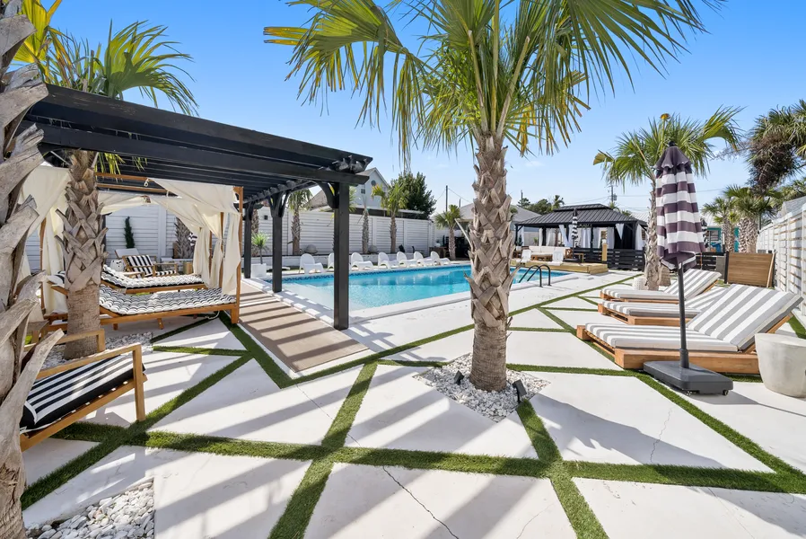Two spacious homes with connecting yards enjoy a shared pool, playground, and a putting green on a double-size lot in Panama City Beach. It's the ultimate versatile space with huge appeal to groups, wedding parties, or multi-generational families looking for a sizable vacation rental with some privacy and independence. Both homes are newly updated, furnished, and turnkey. They offer the potential for renting each house separately, or as one massive complex with six bedrooms and 4.5 baths to accommodate 20+ guests. Bedrooms are all on the first floor and include bunks that families will love. The Derondo house has a king bed and triple bunks, a queen ensuite, and a bedroom with king-over-king beds. The living area has a sleeper sofa and a large couch. The Tanaga house has three bedrooms including a full-over-full bunks, a king bedroom with triple bunk beds, and a queen bedroom with porch access. A pull-out sofa and a large couch provide further sleep options. Renovations include all new plumbing, updated kitchens, bathrooms, and new tile. Outdoors, the incredible recreation area has updates including resurfacing the pool, adding an outdoor kitchen, and a new playground with swings and slides. Extra improvements include a shaded covered eating area and a mini putting green, providing fun for all ages. A curtained gazebo boasts luxury day beds for relaxing while keeping a watchful eye on the kids in the pool. When you need to escape, an indoor game room has a full-sized pool table. Both homes have new kitchens with stainless steel appliances and quartz countertops. One has a functional breakfast bar ideal for feeding youngsters while adults can throw steaks on the barbecue and enjoy alfresco dining beneath the outdoor chandelier. Two separate sitting rooms allow everyone to spread out and find their own space. Sectional sofa seating provides ample space for snuggling close and watching TV as a family before retiring to bed. The complex includes a fully equipped laundry and has ample parking for multiple vehicles. Located south of Highway 98, this unusual offering is just a five-minute walk to the beach and is close to golf courses, supermarkets, and restaurants. It is offered with rentals already on the books that will transfer to the new owner.