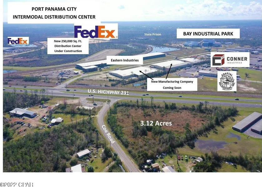 Reduced For Quick Sale! 3.12 Acres on U. S. Highway 231 at the corner of Coe Road. Coe Road goes through to Highway 2301. Located across the Highway from Coastal Helicopters, Bay Industrial Park and the Intermodal Distribution Center (IDC). Located in the path of progress with several new residential developments and new companies coming to the immediate area (e. g. FedEx distribution facility, former Century Boats/Yamaha Motors with new manufacturing company, Conner Industries, Eastern Industries, etc.). Zoned General Commercial (GC-3) in unincorporated Bay County. Great site for many commercial uses; convenience store, retail, storage, restaurant, etc.
