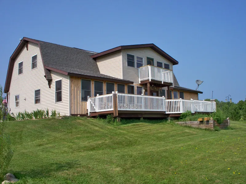 Custom built, move in ready, 3 bedroom home on picturesque 20 acres that is part open and part wooded. Groomed trail leads to a nature pond and permanent deer stand nestled in the woods. Storage space throughout. Main floor master bedroom suite w/ 1/2 bath and walk-in closets. Tile floors on the main level, mud room with walk-in closet. 2 car attached garage/hot tub room and 2nd story workshop. Open kitchen/dining and living area with basswood ceiling and recessed lighting. Main floor combination laundry/pantry/utility room. Off the living room enjoy a large 3 season sun room which faces South offering passive solar gain in the winter months. Spacious full bath. Second level offers 2 huge bedrooms on either end of the house and office space and sitting area along the sides. Second story balcony awards you with panoramic vistas. Wood flooring on the second level. Extra 1 car detached gara...