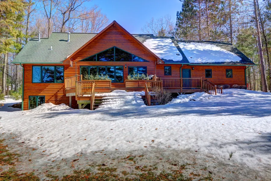 Immaculate home on beautiful Middle Eau Claire Lake. This custom built home was well designed and built with high quality materials and finishes throughout; granite countertops, custom cabinetry, stainless steel appliances, triple pane windows, walk-in pantry, main floor master bedroom w/lake view, central air-conditioning, basement in-floor heat and so much more. Highly desirable location and lot featuring a gorgeous setting among large pine trees, western exposure for spectacular sunsets, level yard with moderate elevation to the lake and hard sand lake bottom. 2 car attached garage, 2 car detached garage, plus a 26'x36' insulated/heated building which was used as a workshop, however, the possibilities are many including bunk house. Dock and boat lift included. This is the complete package, come take a look, you'll be impressed.