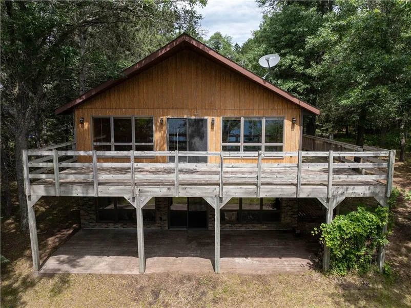 Charming 3BR, 1BA year-round home on 2.6 wooded acres with 166' of south-facing frontage on crystal-clear Middle Eau Claire Lake. Enjoy 1,536 sq ft on the main level with an open floor plan, tongue and groove walls throughout, wrap-around deck, and stunning lake views. The walk-out lower level offers great potential with 2 unfinished bedrooms and a large family room ready for your finishing touches. Stay comfortable year-round with central air. A 24x32 detached garage and 24x32 bunkhouse offer plenty of space for guests, storage, or hobbies. Whether you're boating, swimming, or relaxing by the fire, this peaceful retreat offers the perfect blend of comfort, space, and Northwoods charm. Don't miss this opportunity to own a prime spot on the Eau Claire Lakes chain! Appraisal done in January came back at $750,000
