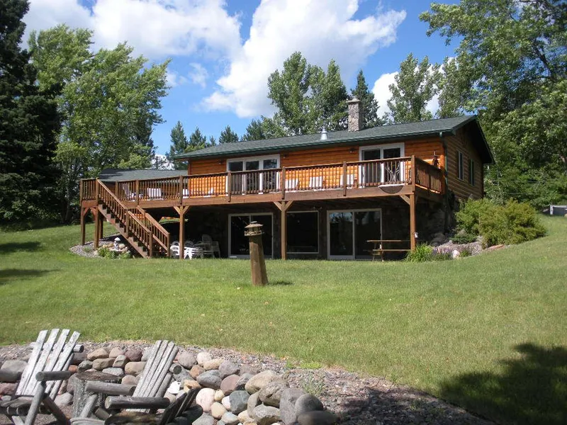 360' of sunny swimming frontage on 260 acre Iron Lake on private 5 acre wooded parcel. A complete custom remodel with full walkout finished basement. T&G interior and half log siding. Everything is either new or in new condition. Fabulous views from both levels as well as the 47x12 lakeside wrap around deck. Home features gas fireplace, stainless steel JennAir appliances, 3 sources of heat, new floorings, new furnace, A/C and home theater system. New dock stays as do appliances & TV w/surround. Two bedrooms upstairs. Basement is finished but open. More bedrooms could easily be partitioned off. Most furnishings can be purchased separately. Move in ready! This is a beauty.