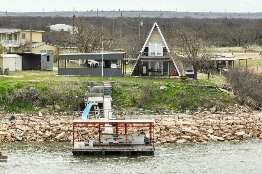 This fully furnished 1304/sf, 2 bedroom, 1.5 bath two-story A-frame cabin is located in the highly sought after Moonshine addition of Lake Kemp on the historic W.T. Waggoner Ranch. In addition to the cabin this property also includes a 30' X 30' carport for parking, a 30' X 30' two-story floating boat dock (built in 2018) with Shore Master boat lift, a 2005 20' Bennington pontoon boat with 4-stroke Yamaha 115 engine (no trailer), and a floating swim up bar. Property is in the first year of a new 10 year lease that is paid in full for the 2023 year, $500 transfer fee is all that is required until January of 2024. Buyer must pass a background check through Waggoner Ranch Estate. A copy of the current lease and property taxes can be found by clicking on the documents tab of the listing.