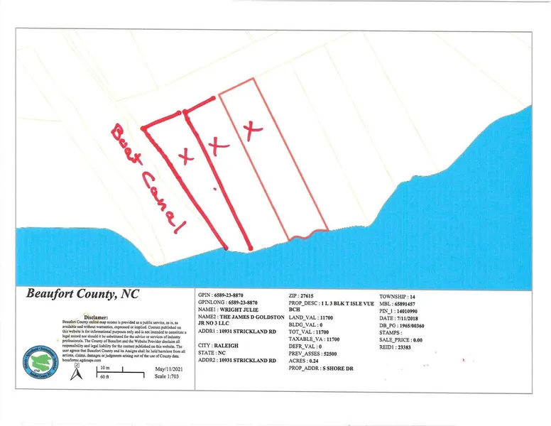 Three waterfront lots, Beaufort County NC, Lots 1,2,3, Block T, Isle Vue Beach Subdivision, Beautiful many miles view across the Pamlico River. .65 Acres Adjoins boat ramp canal on west side of lots. (Canal recently dredged.) Well kept community known as Isle Vue Subdivision. Septic permit current. Flexible covenants with 600 sq ft and/or approved tiny housing allowed. Campers or tents limited time for guests. $40000 1/2 can be financed.