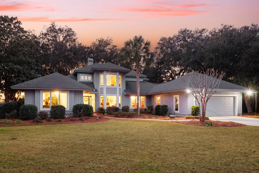 Lush, mature landscaping frames this spacious Moss Creek home, sited along the Tom Fazio-designed Devil's Elbow South golf course. The exterior evokes a classic Hilton Head Island style, while abundant interior windows and skylights bring the natural setting inside. New Hickory hardwood floors extend throughout the gracious main living spaces, including the formal living room, dining room, and two-story great room. The expansive kitchen features custom cabinetry with pullouts/built-ins, soft closing drawers, Siltstone counters, a Sub-Zero refrigerator, double ovens, an instant hot water tap, a wine rack, and a walk-in pantry. Four bedrooms include a desirable main-level primary suite with a spa-like bathroom boasting two vanities, a walk-in shower, and a soaking tub. A charming Carolina room leads out to the back deck overlooking the golf course and tidal marsh. With ample storage and a new HVAC system under warranty until 2030, this home is ready for a new owner to embrace this Lowcountry lifestyle. Moss Creek is a premier waterfront community with a marina, pools, a fitness center, and a dog park close to this property. In addition to the two Tom Fazio golf courses, tennis courts, and new pickleball courts, the community's state-of-the-art clubhouse is slated to open this spring.