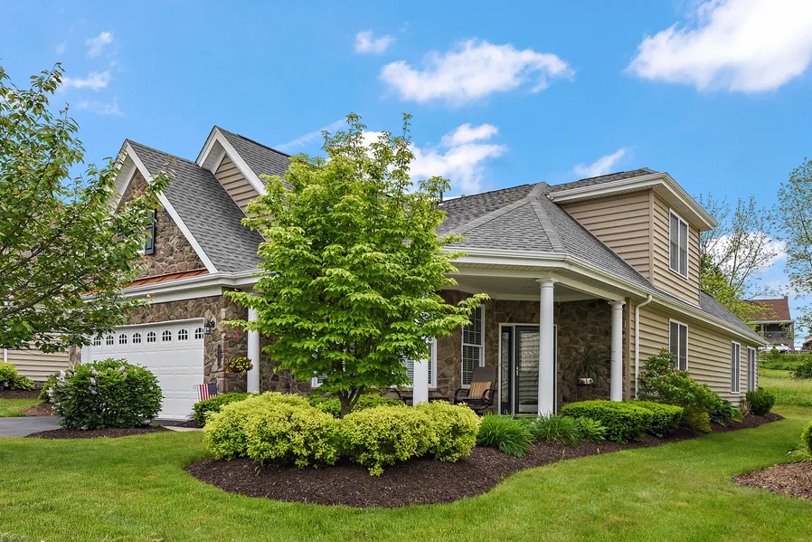 Enjoy majestic sunsets from the front porch of this low-maintenance three-bedroom home. Gleaming hardwood floors greet you at the front door and flow thru the spacious dining room into the beautiful kitchen that boasts stainless steel appliances and granite countertops. The kitchen opens up to the two-story family room and the bright sunroom from where you can wander out onto a private patio. The owner's suite, second bedroom, full bath, den, and laundry complete the first floor. The second floor includes a game room, additional office space, a third bedroom, and a full bath. Large closets and storage throughout! Make this house your home and relax in the Liberty Hills 55+ Community that includes a clubhouse, pool, exercise room, and more.