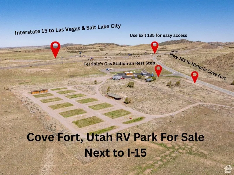 RV Park with on-site manager living quarters. This is a turn-key operation at historic Cove Fort, in Central Utah. 33 Full hook-ups with room to grow. Ideal location at the intersection of I-15 and I-70 for all the traffic passing through, as well as the short-term construction projects in the area. Facility has grass areas for each of the main sites and a shared laundry/restroom & shower facility. Property's west boundary line has frontage along I-15. Additional acreage available if buyer wants more property surrounding the site. Acreage is estimated for listing purposes. Access: From I-15 exit 135, head east to the Terrible's gas station entrance, drive south in their parking lot past the building to the entrance of the RV park.