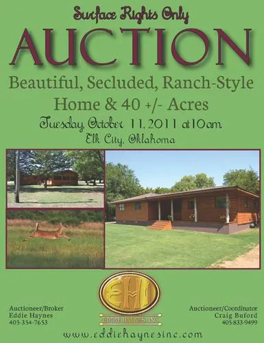 Research Parcel InformationFrom Elk City, Interstate 40: take exit 35 (Merritt Road) north 1.3 miles to stop sign, left (west) on 1-40B, take quick right on Hwy. 6N. Go approximately 3 miles then take right on N1940 approximately 1 mile to stop sign. Go left (west) on E1100 Rd. 1/4 mile to gated entrance on the right (north).