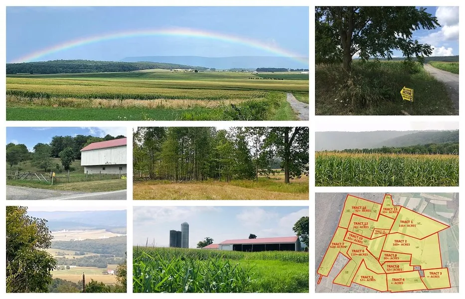 965+-ACRES OF PRIME LAND! Mix of farm pasture & crop land, mountain land & woodland ranging from 10+, 50+, 100+, & 150+acres offered in 14 separate tracts, combination(s) of tracts & as a whole. Located in fertile Morrisons Cove. Excellent soils. Road frontage on ALL tracts. Outbuildings in good condition. Water on multiple tracts. Beautiful views in every direction. Near state game lands. Easy access to PA Turnpike, I-99 & Rt.30. See website for details.